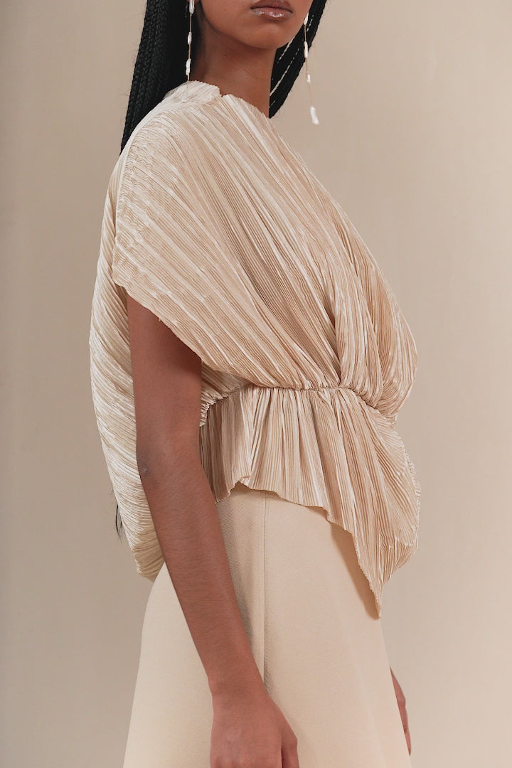 An asymmetrical top in pleated satin that drapes over your body to create a wave-like effect. Top is has a toga design which sits on one of the shoulder. Has an asymmetrical hemline as well.