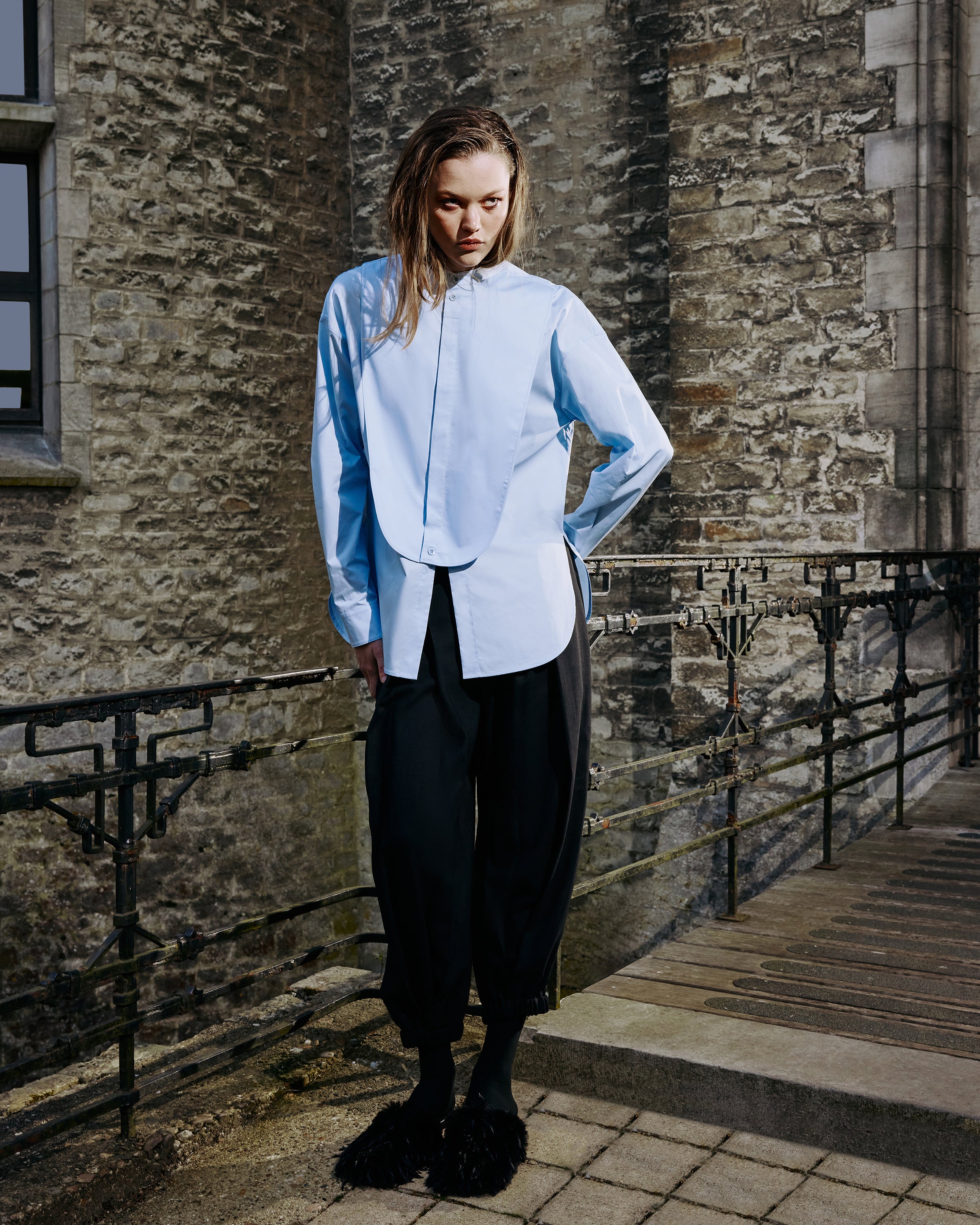 TIBI Eco Poplin Tuxedo Shirt With Bib Flap in Chambray Blue