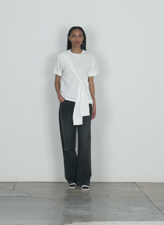 We love to tie a sweater around our favorite t-shirt, so we thought why isn't it integrated into the tee? Introducing the Tie T-Shirt. Crafted from 100% cotton for a 12 Mo’er approach, this t features two long-sleeve ties sewn into the back, for multi-purpose use. All of our CPs out there will have a field day with this. Pull one sleeve over and one around the waist or leave them undone. In short, the sartorial opportunities are endless.