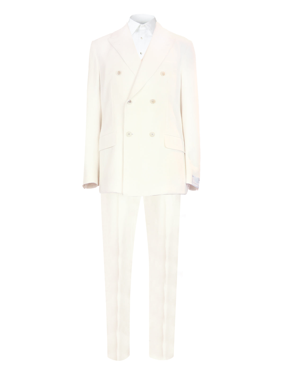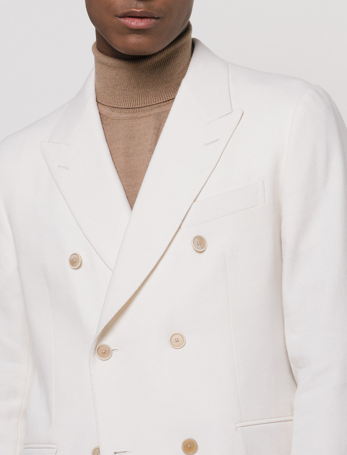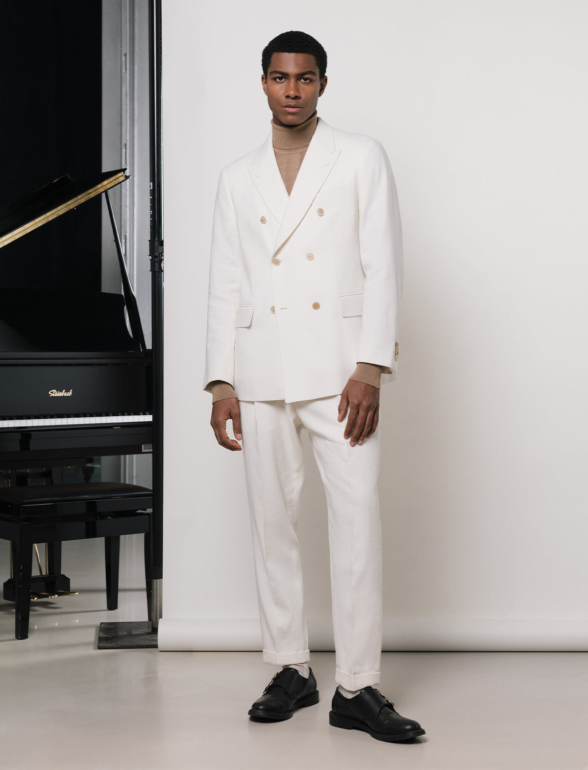 Crafted from pristine white linen, this double-breasted Figaro suit showcases Caruso's impeccable craftsmanship from every angle. The blazer is lined into a sturdy, comfortable piece detailed with functional pockets both inside and out. Layer yours above a neutral turtleneck jumper in colder weather and complete the sophisticated look with loafers.