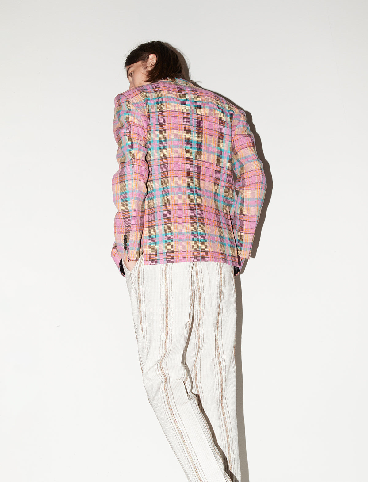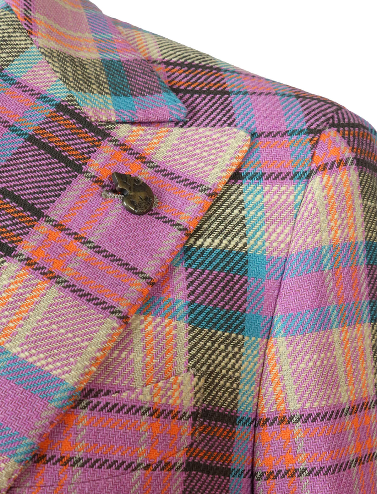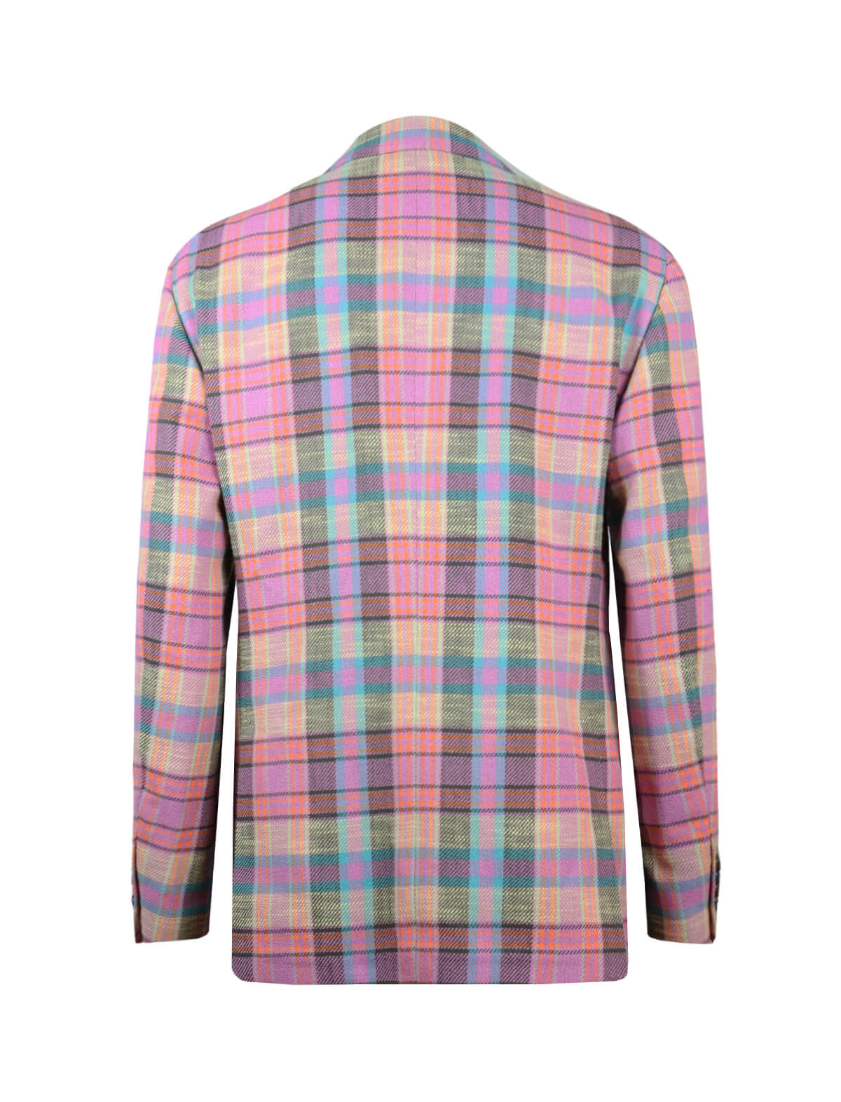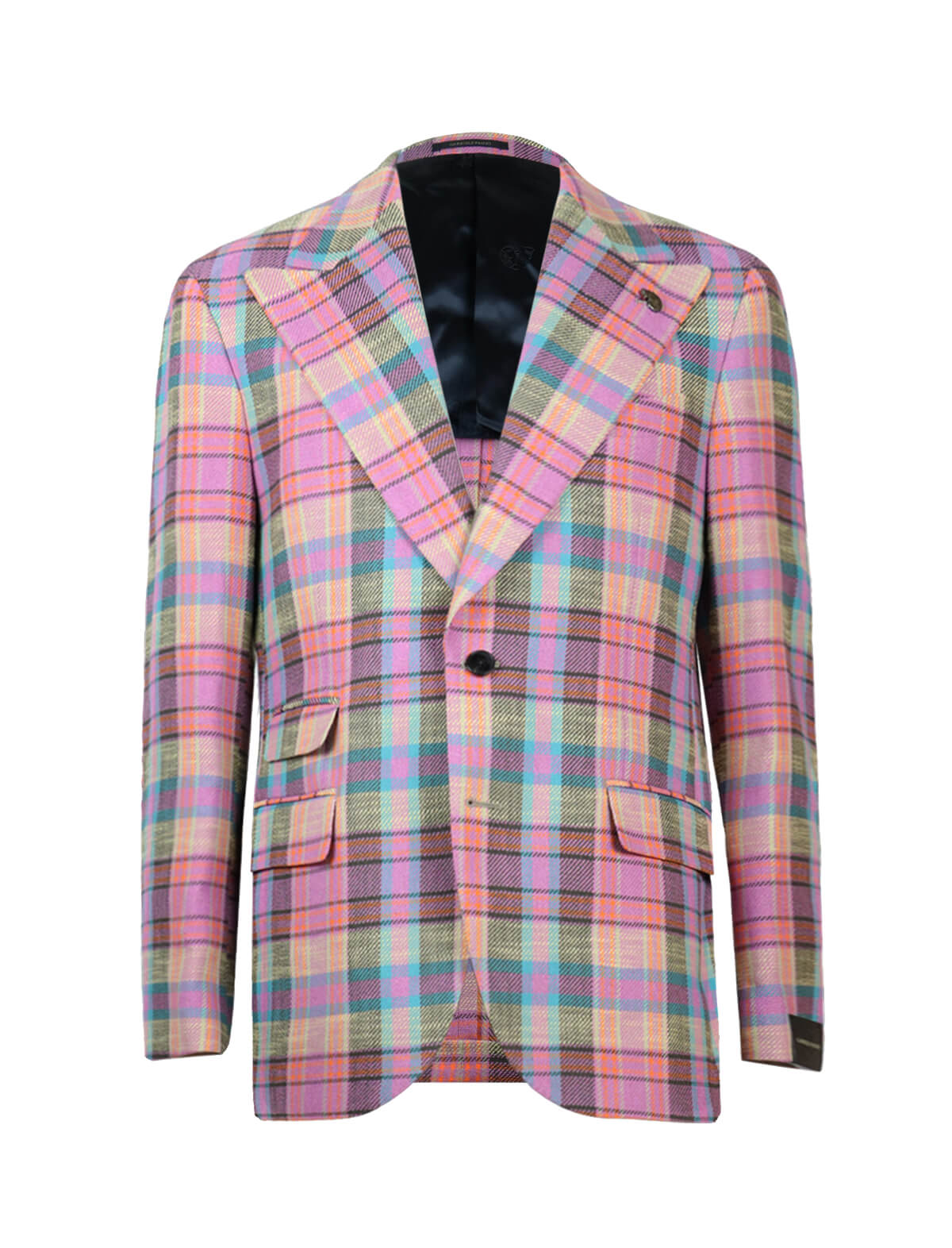 The statement jacket you need this summer, this eye-catching piece is cut from a plaid cotton-blend in a thoughtful mix of some of summer's favourite colours in pink tones. Featuring an unlined back ideal for warmer days, functional pockets, large notched lapels and buttoned cuffs. Gabriele Pasini's unique signature skull detail is positioned elegantly on the tip of the left lapel.
