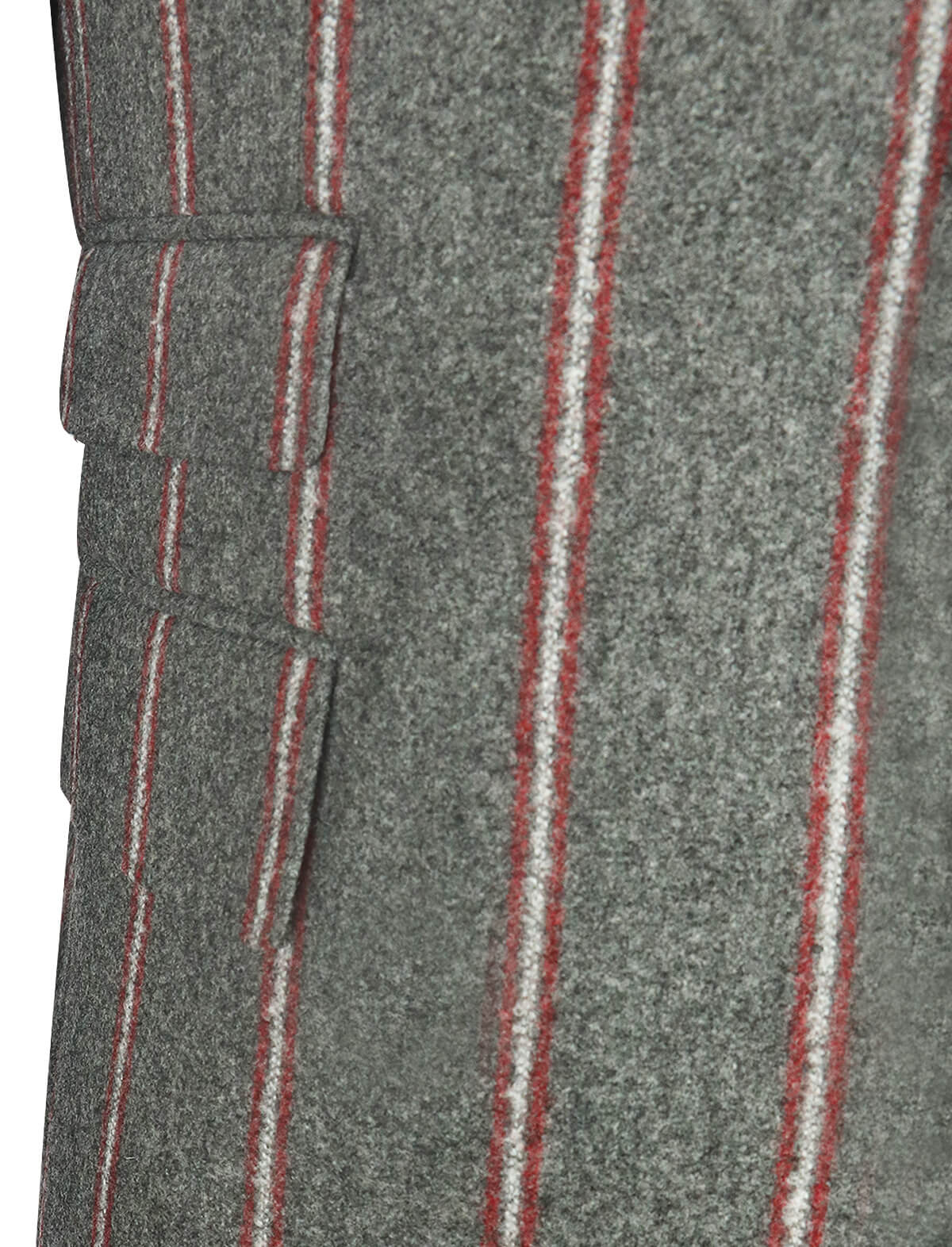 The perfect suit for the office on a chilly day, this set comes with a single-breasted jacket in dark grey with red-white pinstripes, equipped with 3 convenient flap pockets (2 on the right and 1 on the left), and comes with notched lapels. Both the jacket and matching trousers are made of 100% high-quality wool. Gabriele Pasini's unique signature skull detail is positioned elegantly on the tip of the left lapel.