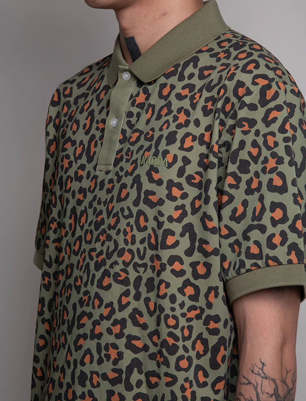 Cut from a lightweight moisture-wicking fabric, Paltabor is a classic 2-button polo short sleeve shirt elevated with a 3D-printed Radda branded detail and a statement animal print. Available in caramel and olive.