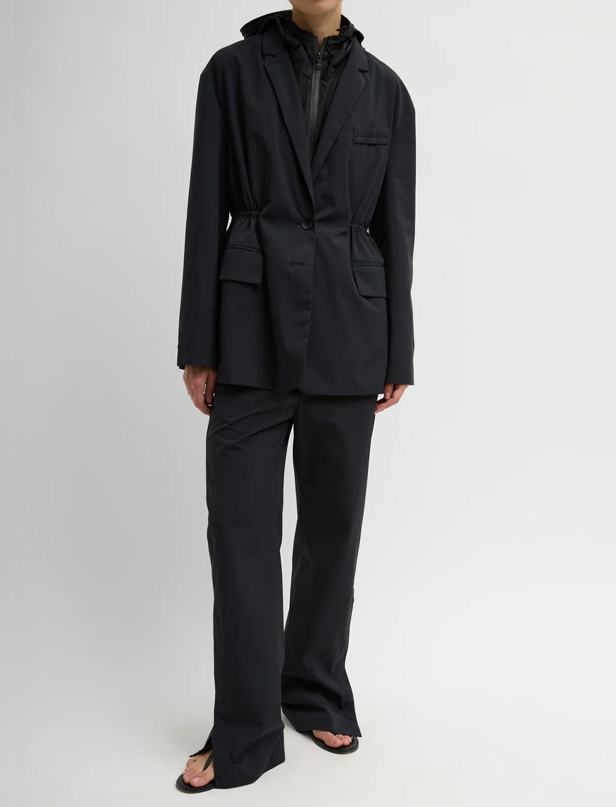 The Tech Suiting Anorak Blazer redefines functional tailoring. Crafted from waterproof bonded nylon with a smooth, durable finish, this style includes a detachable hood and adjustable waist cords that cinch to create a peplum effect.
