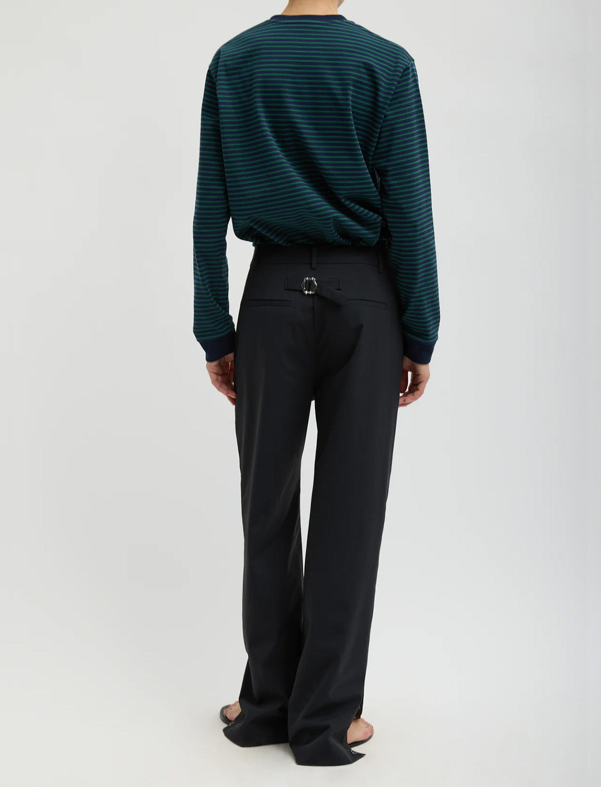 From this season’s new suiting group, the Tech Suiting Mark Trouser is crafted from waterproof bonded nylon with a soft hand and laminated finish for durability. The silhouette blends elements of the Jules Trouser and Elfie Pant, featuring snaps at the hem for customizable slits, an adjustable back belt, and functional pockets for true utility.
